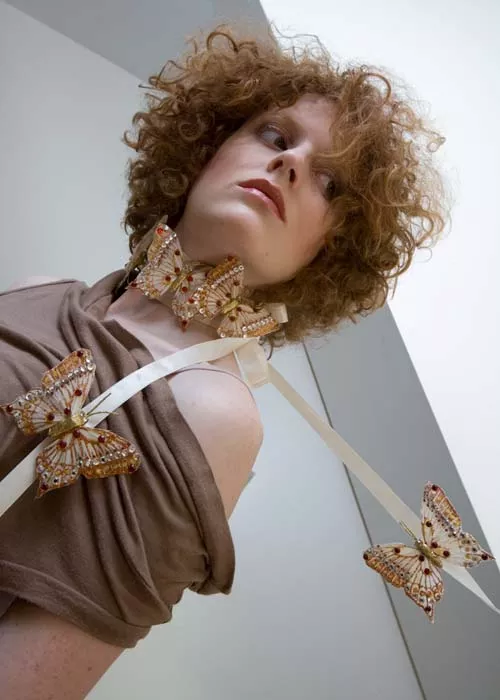Butterfly choker, by Dulcet Designs; available exclusively at Julep. Brown convertible cowl-neck tunic, by Anzevino and Florence.
