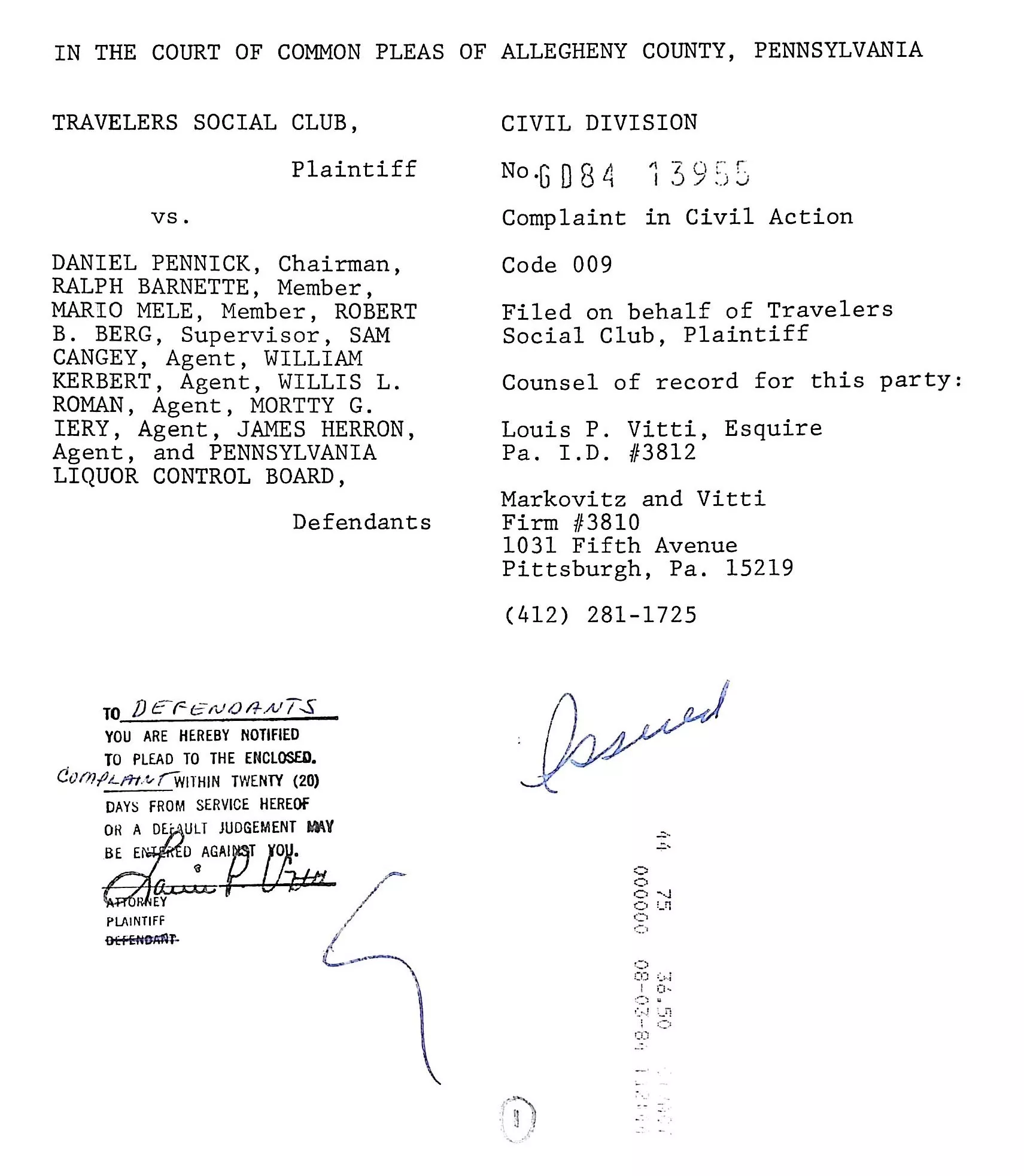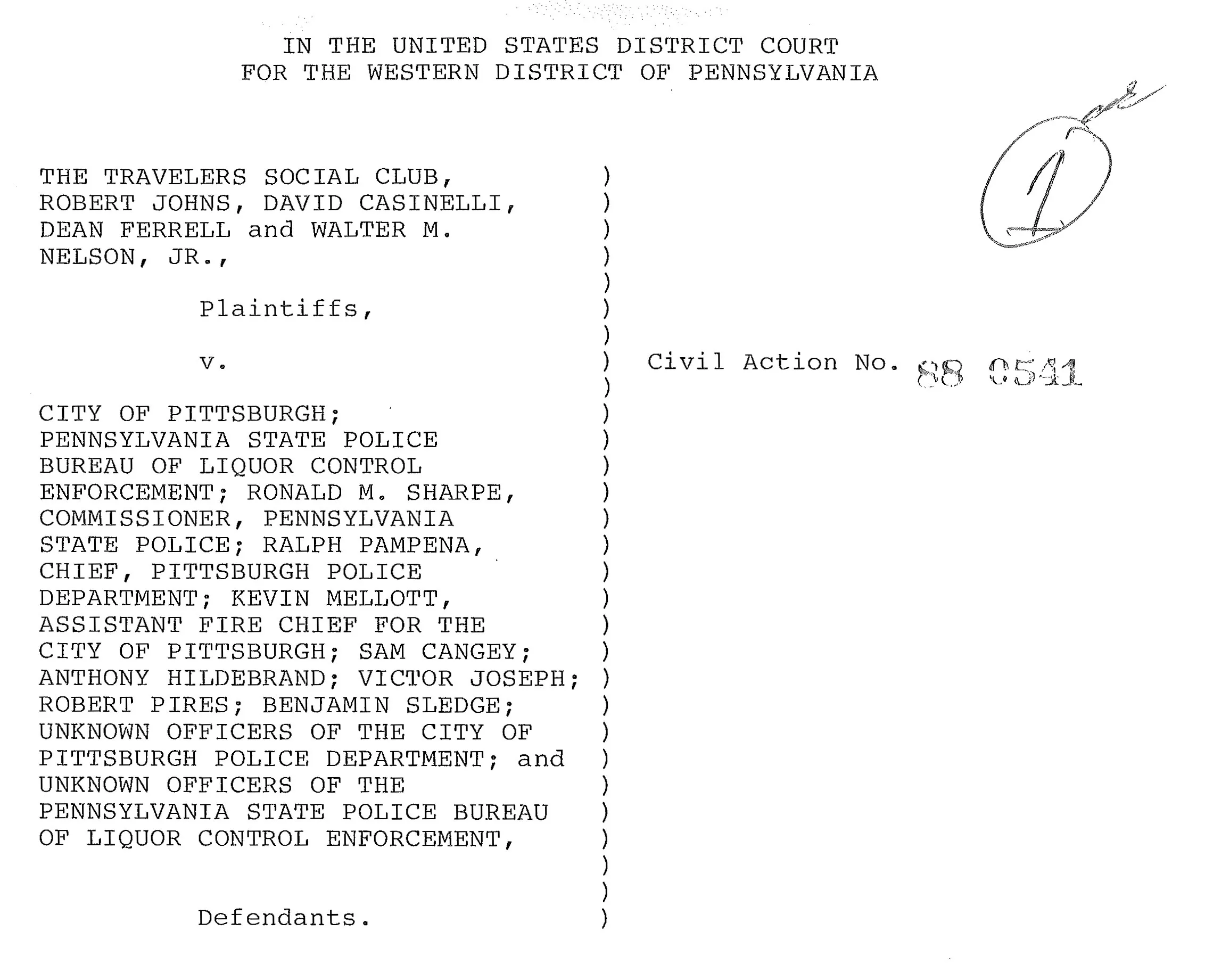 In September 1984, Travelers sued the Pennsylvania Liquor Control Board (PLCB) and several of its then-agents for selective prosecution and harassment (liquor control enforcement transitioned from the PLCB to the BLCE between 1987 and 1988). The 1984 case was working its way through the Commonwealth courts when, on Feb. 14, 1988, BLCE agents, along with fire department officials and Pittsburgh police officers, burst into Travelers and forced everyone out into the freezing pre-dawn weather.