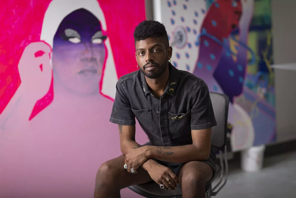 While accompanying Devan Shimoyama during a tour of his first museum solo exhibition, Cry, Baby, at The Andy Warhol Museum, the word “dazzling” comes to mind. The Pittsburgh-based artist and Carnegie Mellon University professor demonstrates a flair for the wild and dramatic, with paintings and sculptures liberally festooned with glitter, boa feathers, and rhinestones. But beneath all the pleasingly distracting sparkle and fantastic imagery simmers racial, sexual, and economic anxieties, all of which powerfully resonate throughout Shimoyama’s work.
