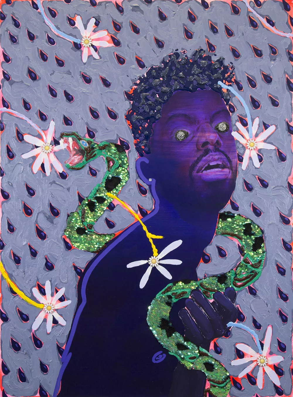 Shimoyama also draws on folklore and beliefs from his Japanese and Trinidadian background, ancient Babylonia and Sumeria, and the African diaspora. This plays out most prominently in his repeated use of the snake. In contrast to the Christian concept of the creature as the Garden of Eden villain, Shimoyama’s sequin-covered, two-headed serpent aligns more closely with the African deity Mami Wata by serving as a companion, winding itself around each subject in a loving, protective embrace.