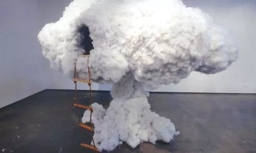 Wegner’s work bears a visual pun with sober implications: The ladder and title suggest that the colossal explosion of polyester filling be read as a tree. And this allusion to children’s hideouts and secretive clubhouse games gives the work a knife-sharp edge in light of recent anxieties over nuclear proliferation.