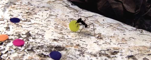 In Neuenschwander’s short video ‘Quarta-Feira de Cinzas/Epilogue” (which translates, essentially, as “Ash Wednesday”), showing as Forum 60 in the Carnegie Museum of Art, the artist finds beauty in such acts of normality. Not, in this case, amongst people, but rather within the even more hierarchical, more regulated world of insects. Ants, videotaped in extreme close-up on the floor of a rainforest in her native Brazil, find pieces of sugar-soaked confetti and haul the sweet treasure toward their homes.