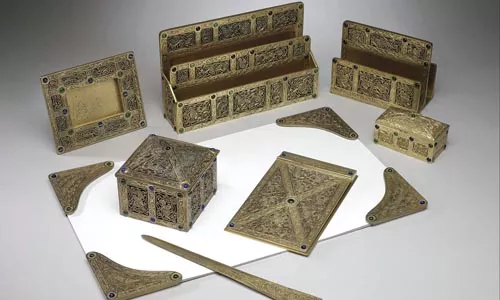 Distinctive Desk Sets: Useful Ornament from Tiffany Studios exhibit collects an array of bronze desktop accoutrements produced by the Tiffany Studios between 1900 and 1930, some familiar and some anachronistic. While there are the familiar paper knives, inkwells, blotters and stationery trays, some objects have no equivalent in the modern workstation, and require decoding.