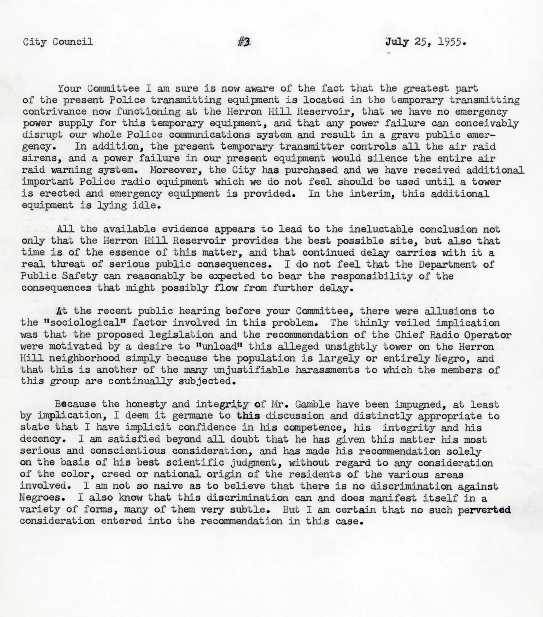Page from a July 25, 1955, letter from Pittsburgh Public Safety Director David Olbum to the Pittsburgh City Council denying charges that the police radio tower was being built in Sugar Top because its residents were Black Credit: PHOTO: Courtesy City of Pittsburgh Archives