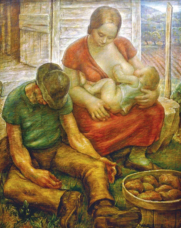 By contrast, Roy Hilton’s “The New Dress” (1934) is more gently dappled and spatially rendered. But its strength, as in Richardson’s work, is a study in personal resourcefulness and challenge.