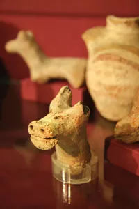In the many cases are an early Bronze-Age tool kit, kitchenware and a pitted rock “thought to be a board for an early version of the Egyptian game Senet,” says the label. There are combs, beaded jewelry and female figurines, Egyptian scarabs, plaques of Astarte and a libation tray, bone dice, a bone flute and slingshot stones, still seemingly Intifada-ready.