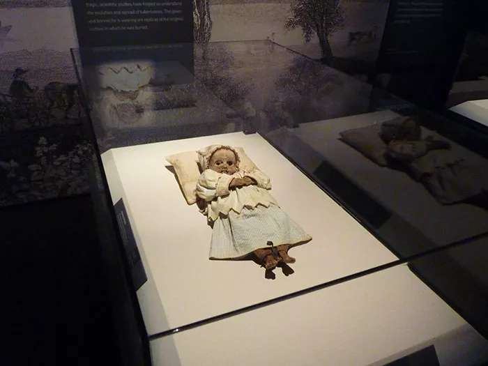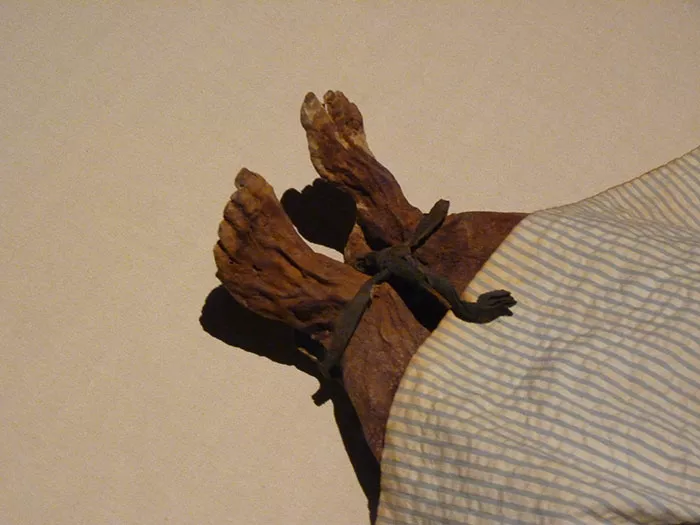 On that last point, look to the final room of the exhibit, where the bodies of two parents and a one-year-old child are displayed in glass cases under bright lights. This is the Orlovits family, “a group of 18th-century mummies discovered in Vác, Hungary in 1994.” DNA analysis of the parents, Michael and Veronica, shows evidence of severe tuberculosis, but baby Johannes has no such symptoms. In fact, he still has “baby fat,” a term that is never fun to apply to a dead person. Most strikingly, Johannes’ feet are bound by a small ribbon of cloth.