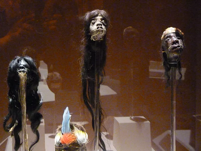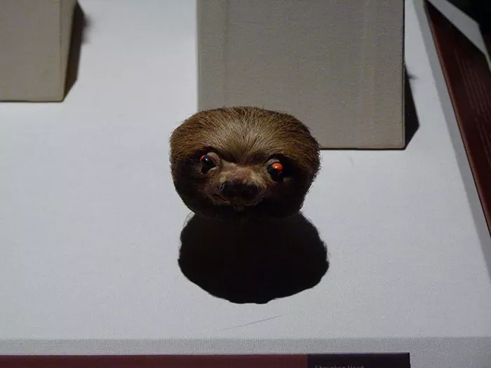 In the artificial mummification camp, there’s a collection of shrunken heads, a tradition associated with South American tribes in which heads of vanquished enemies are taken as war trophies. The process generally involves removing the skull, boiling the remaining flesh and skin, filling it with a rock to retain its form, and decorating it. There is also a sloth head in this section.