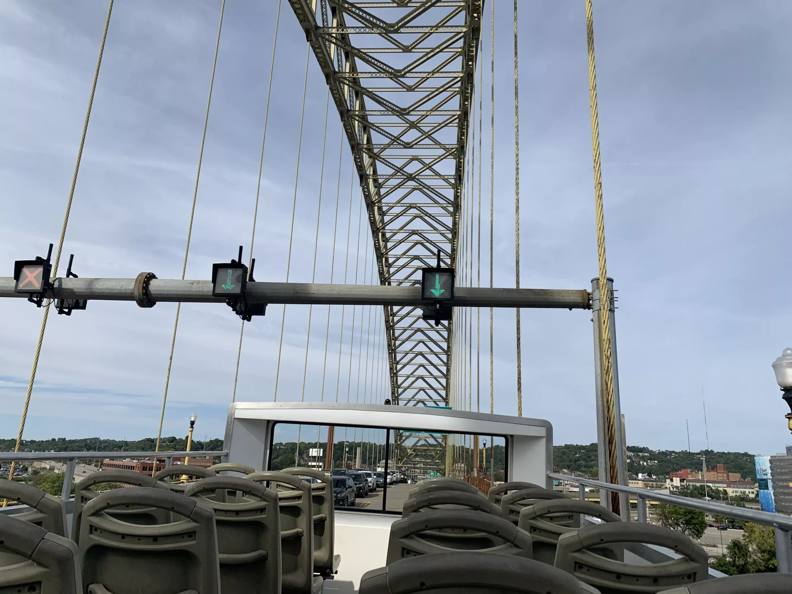 In the open air, I find myself at eye level with all the Victorian architectural details of buildings along East Carson Street Sailing through Downtown, we come so close to the gold marquee and ornate iron rail on the William Penn Hotel that I could reach out and touch them. The tour route doesn’t go on any highways, instead crossing three bridges, and my jaw drops passing only feet under the traffic lights on the West End Bridge, with a spectacular view of the yellow arches above.