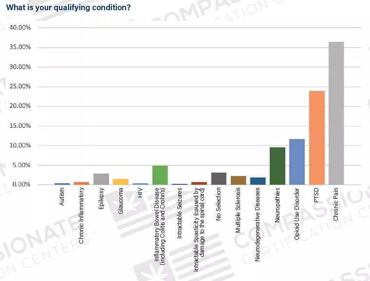 Pennsylvania has 23 qualifying conditions that are applicable to the state’s medical marijuana program. According to the survey, the two most commonly cited conditions were chronic pain and Post Traumatic Stress Disorder (PTSD). About 37% of patients use marijuana to treat chronic pain and 24% use it to treat PTSD. Opioid-use disorder was a distant third, with about 12% of Pennsylvania’s medical marijuana patients.