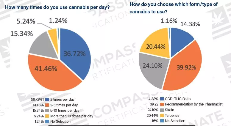 Preferred methods of ingesting medical cannabis were about 46 percent oral (pills, etc) and about 44% inhalation and vaping. Patients also appear to be taking medication throughout the day. More than 41% of users use medical marijuana 2-5 times a day, and more than 15% take medication 5-10 times a day. About 37% use marijuana just twice a day. More than 39% use the recommended dose of the pharmacist.