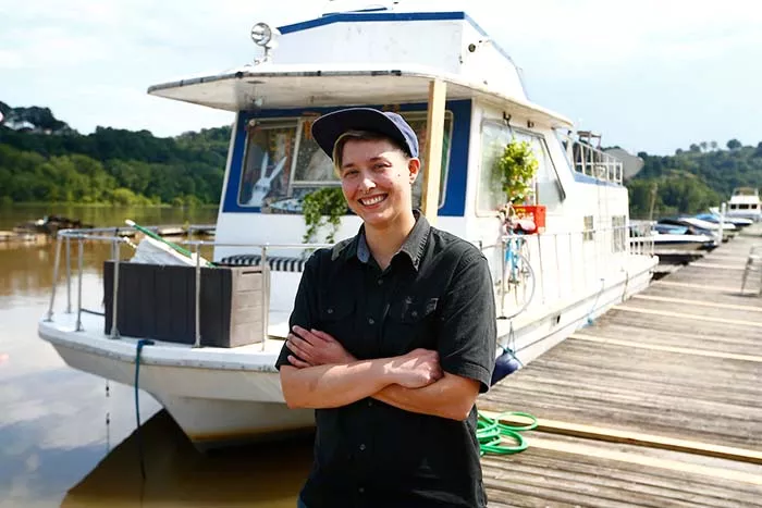 Mia Macdonald with her houseboat along the Allegheny River at the Bell Harbor Yacht Club Credit: CP photo: Jared Wickerham