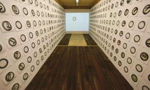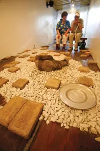 More archeological than anthropological is the meticulously crafted faux excavation “The Pok Cave,” by Chilean-born Alberto Almarza. Pinch pots and fertility fetishes are balanced on sandy mounds beside (disturbingly realistic) clay and burlap mummies. On one side of the space is a textured rock face, riddled with softball-sized openings. Each opening, lit from within, is capped by a magnifying lens for viewing a treasure-trove of miniature artifacts.