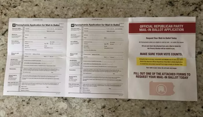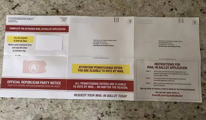 According to photos obtained by City Paper from a registered Republican voter in Allegheny County who asked to remain anonymous, the RNC is currently mailing some voters mail-in ballot applications and encouraging them to fill them out and return to their county elections office.