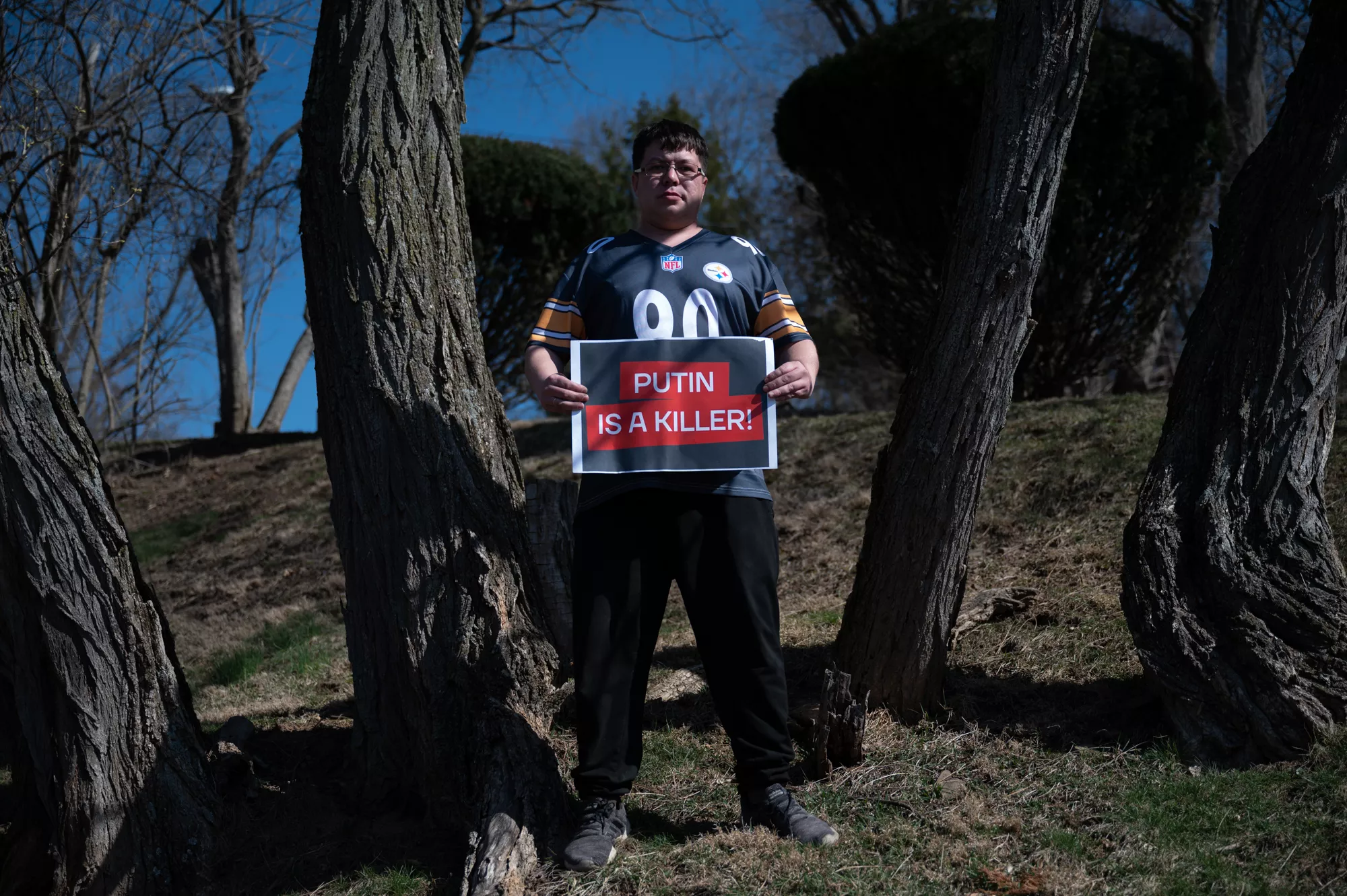 Amir Mingazetdinov poses for a portrait while holding a “Putin is a Killer” sign on March 13, 2025. Credit: CP Photo: Mars Johnson