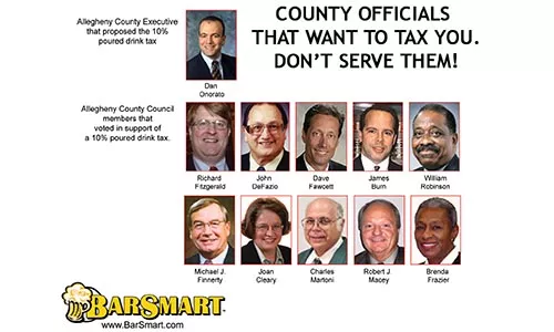The protest is being organized by Barsmart.com, a website for reviewing and discussing local bars and nightlife. A discussion in the forum section of that site came up with the idea of creating a handbill with pictures of County Executive Dan Onorato and each of the 10 county councilors who voted in favor of the tax. Available on the Web site www.dontservethem.com, the flier serves as a not-wanted poster: Above a rogues’ gallery of photos (which were culled from the county’s Web site), the poster urges “Don’t Serve Them!”