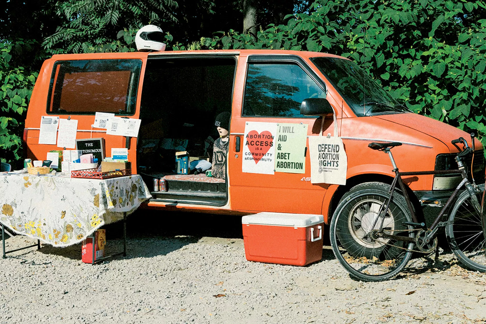 Now, Ott drives the cleverly-named Autonomous Body Shop around the city. Offering free condoms, Plan B, pregnancy tests, Narcan, and informational zines, and decorated with an enormous flag that reads “we will aid and abet abortion,” it’s a very visible and unabashed resource.