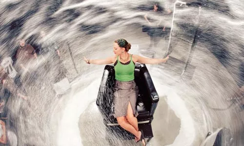 Nowhere is viewer activation more necessary than in Belgian artist Lawrence Malstaf’s “Nemo Observatorium” (2002), where a cyberpunk-inspired throne stands at the center of a giant PVC cylinder. A visitor must flip a switch to commence the whirring of five fans, which send Styrofoam beads whirling around the cylinder’s periphery in amazing, ever-changing patterns. The installation’s use of wind to blow chaos around the visitor — who remains untouched by the influx of air — seems somewhat Buddhist in philosophy: not only an impressive demonstration of physical laws, but a visual representation of enlightenment.