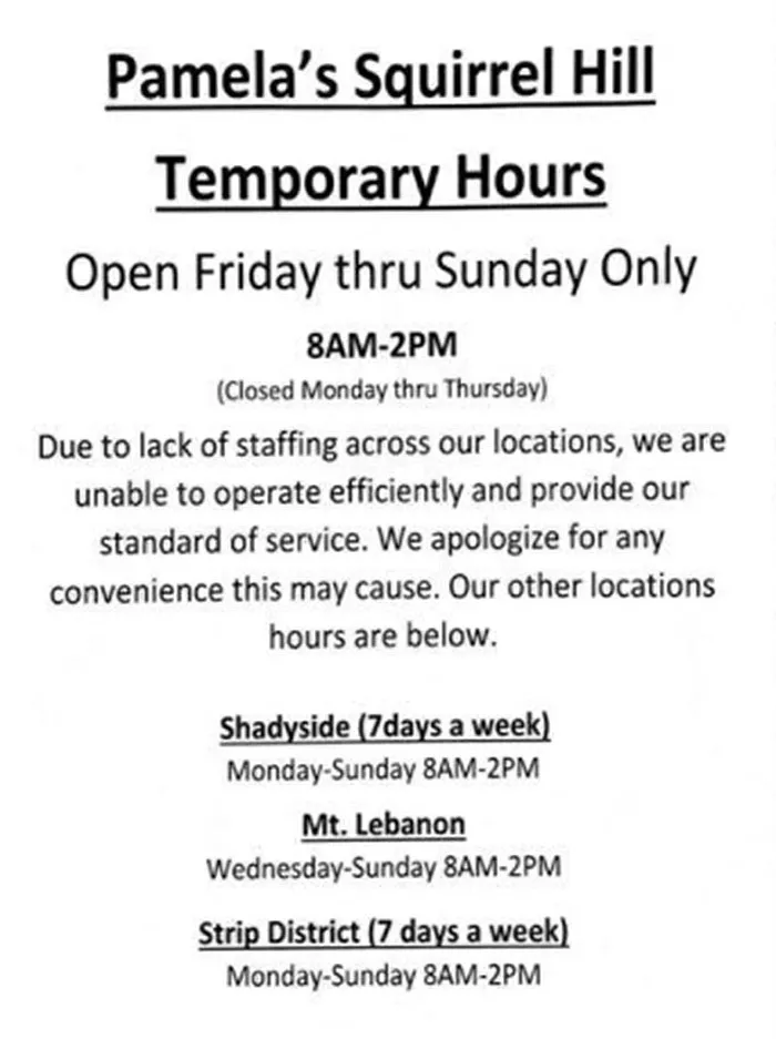 Sudden work shortages also recently hit local breakfast chain Pamela’s Diner, who announced on June 27 that hours at the Squirrel Hill location would be reduced due to “lack of staffing across all locations.” Pamela’s deleted that post, but still announced the hours would be reduced, and that they were working “vigorously to reopen more days in the near future.”