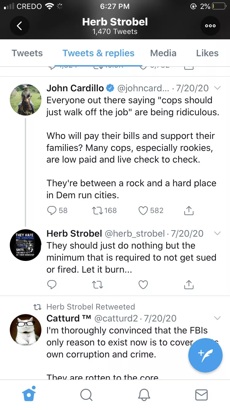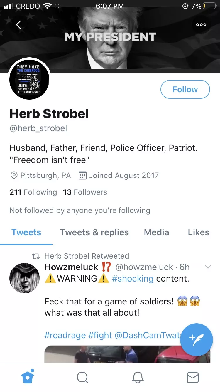 The account, @herb_strobel, has several posts that imply police shouldn’t be doing their jobs if they receive criticism or regulation from lawmakers. The account, which has since been switched to private, is described in its profile as “Husband, Father, Friend, Police Officer,” according to screenshots sent to Pittsburgh City Paper. The Strobel Twitter account also has a banner image of President Donald Trump with the caption “my president.”