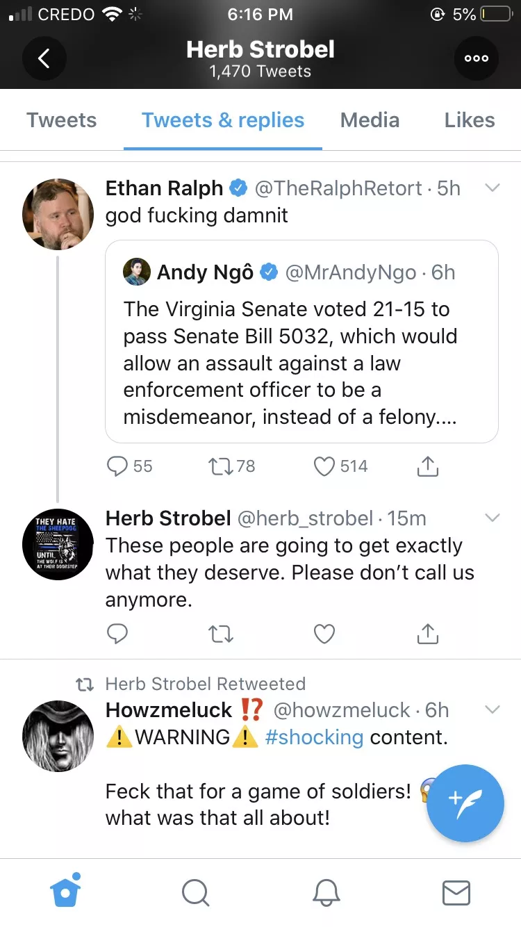 Sometime last week, the Strobel account responded to a tweet about a Virginia law that would eliminate the mandatory minimum sentence for a simple assault or an assault and battery committed against a judge, police officer, firefighter, and other first responders. Strobel wrote, “These people are going to get exactly what they deserve. Please don’t call us anymore,” apparently implying that people shouldn’t seek police assistance because of this proposed law in another state.