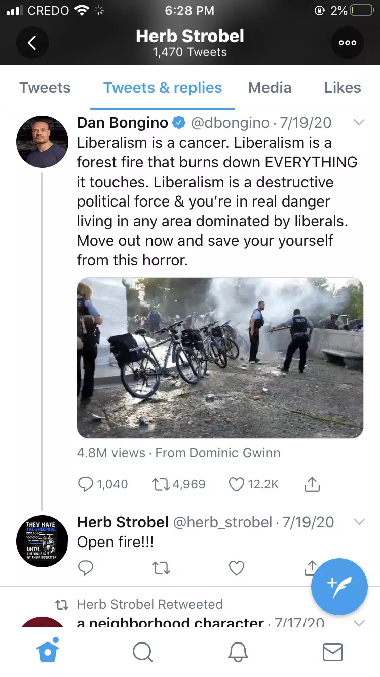 The Strobel account tweeted the “Let it burn” comment on July 20. In response to a July 19 tweet from far-right media personality Dan Bongino that claims “Liberalism is a cancer” and “you are in real danger in any area dominated by liberals” attached to a video of empty cans and bottles being thrown at police officers, the Strobel account tweeted, “Open fire!!!”