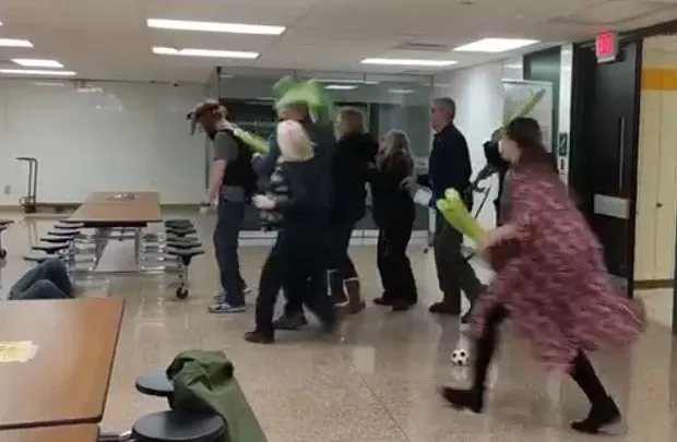 In another drill, the actor entered the cafeteria and “shot” another victim, but this time he was just wearing a vest, a red wig, and goggles. He also wore a costume that included a face mask, a black wig, and what appears to be a large grey beard.
