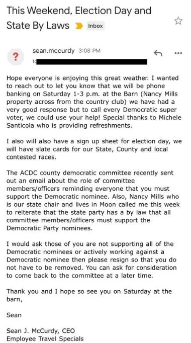 Pennsylvania Democratic Party chair Nancy Patton Mills, a Moon Township resident, also has warned committee chairs and members to stop supporting non-Democrats. In an Oct. 24 email obtained by CP, Moon and Char Valley Democratic committee chair Sean McCurdy wrote that Mills called him to reiterate the state party bylaws that committee members and officers must support nominated Democrats.