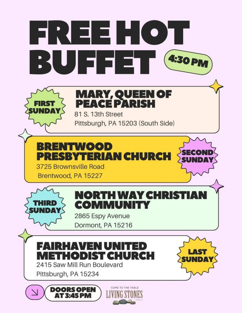 Living Stones is a non-profit serving the South Boroughs communities of the greater Pittsburgh area. Living Stones serves a hot buffet four Sundays a month as well as a free breakfast and lunch once a month.