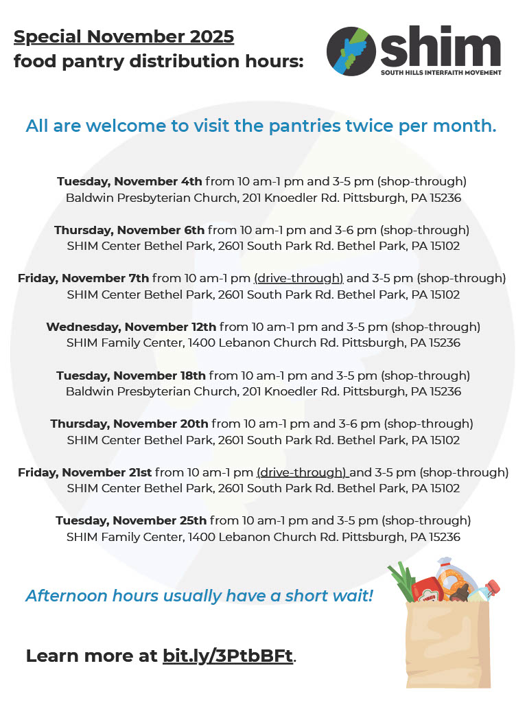 Distributes food to South Hills families and supports immigrant communities. Pantry hours vary. Below is the updated schedule for November: