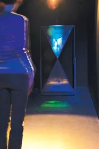 Nearby, “Real Time Vanitas” (2002) is a contemporary reference to an ancient concept: a memento mori, or reminder of our mortality. A photograph, taken while the viewer passes beneath a ceiling-mounted camera, is projected onto the sand in a sort of “flat-screen” hourglass. On my visit, the sand had largely run out, leaving nothing for my image to be projected on. Still, this, too, makes an unsettling statement: Here is a visualization of time lost, and of our inability to make even a fleeting mark. A very Twilight Zone notion.