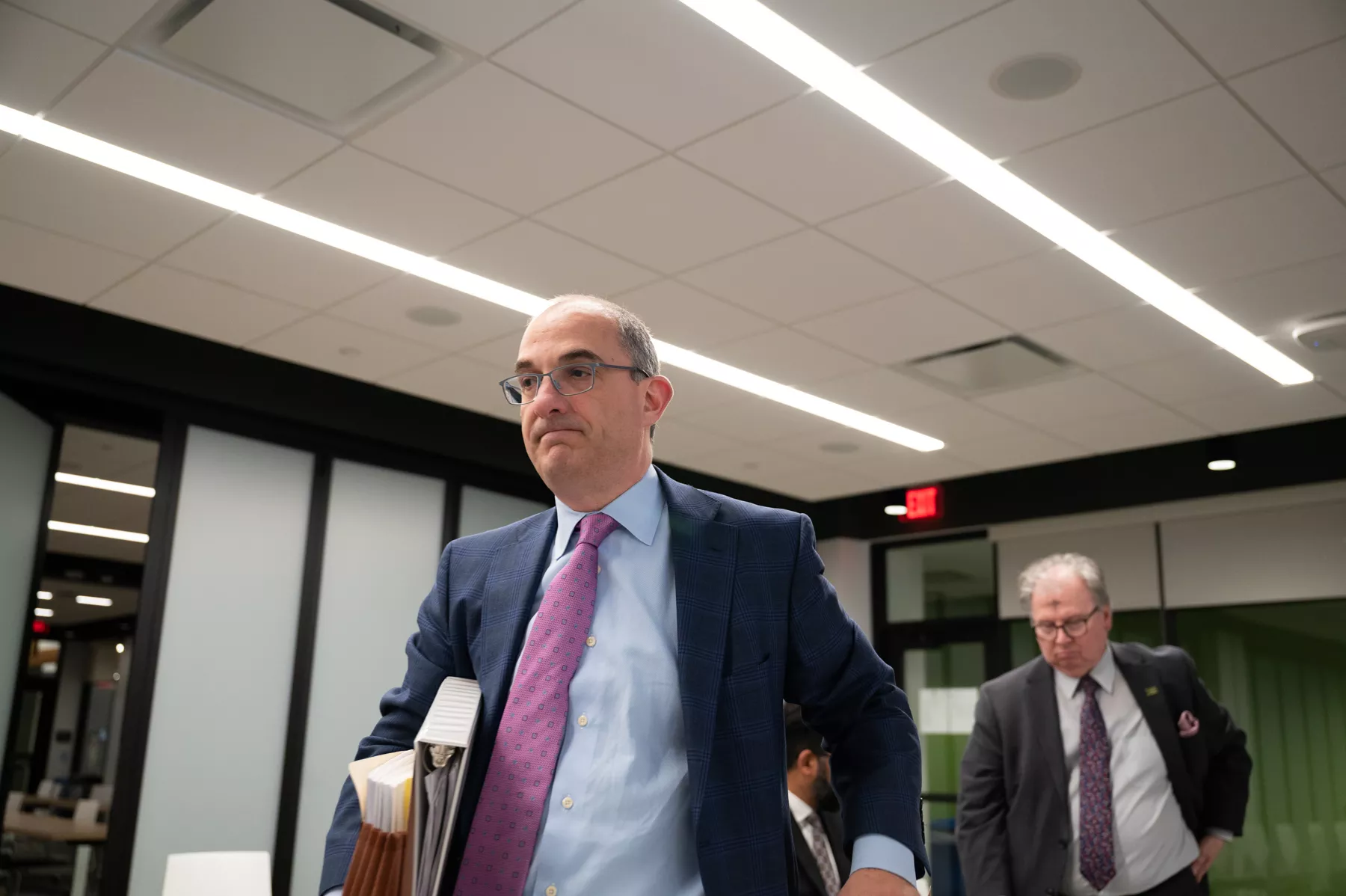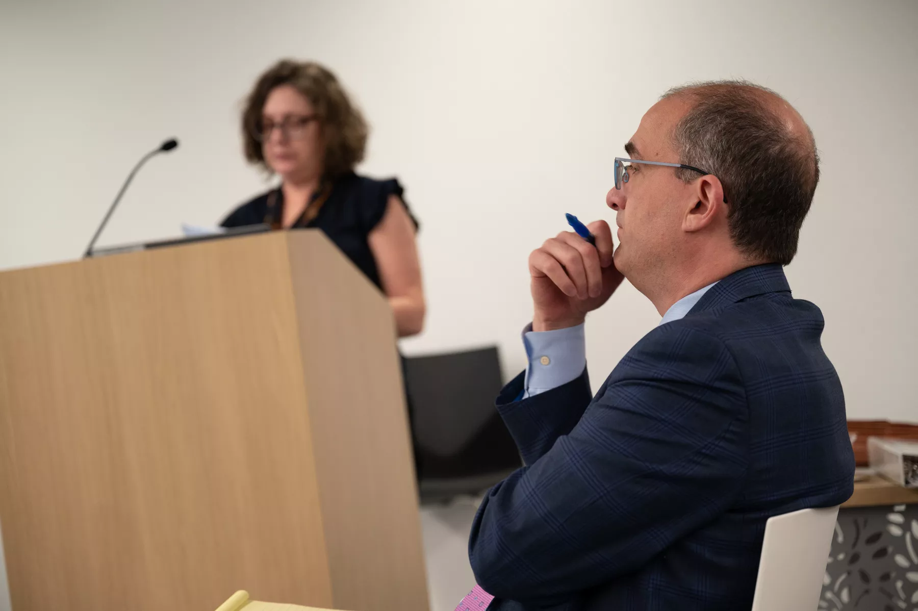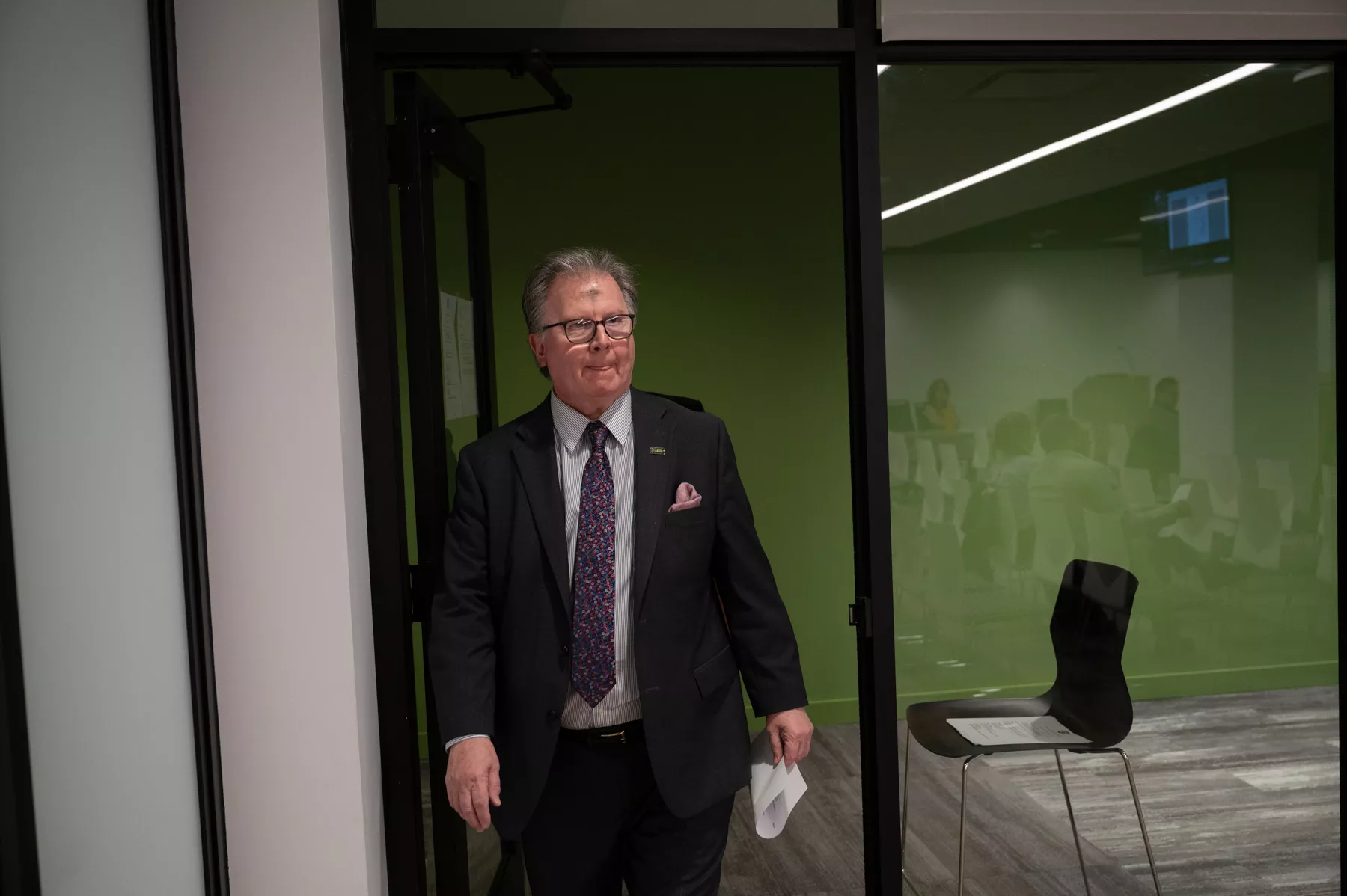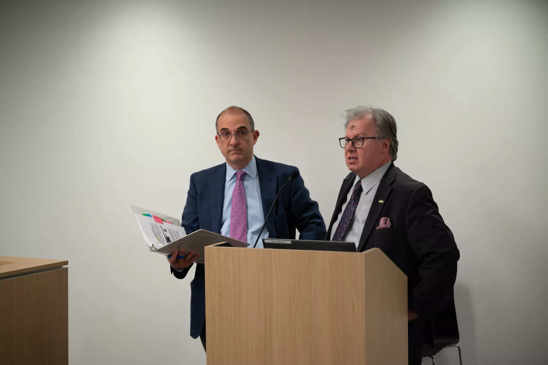 An older man in a suit and glasses holds papers while another older man in a suit speaks