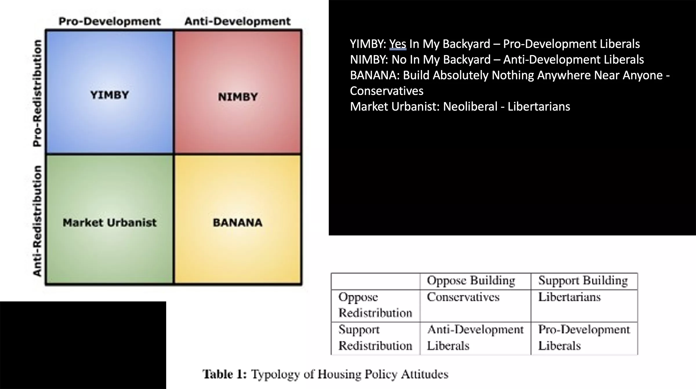 Slide used by Elliot Tretter in a 2019 Association of American Geographers conference papers on YIMBYism. The slide shows the types of housing policy attitudes and where YIMBYs fit. Credit: Courtesy of Eliot Tretter.