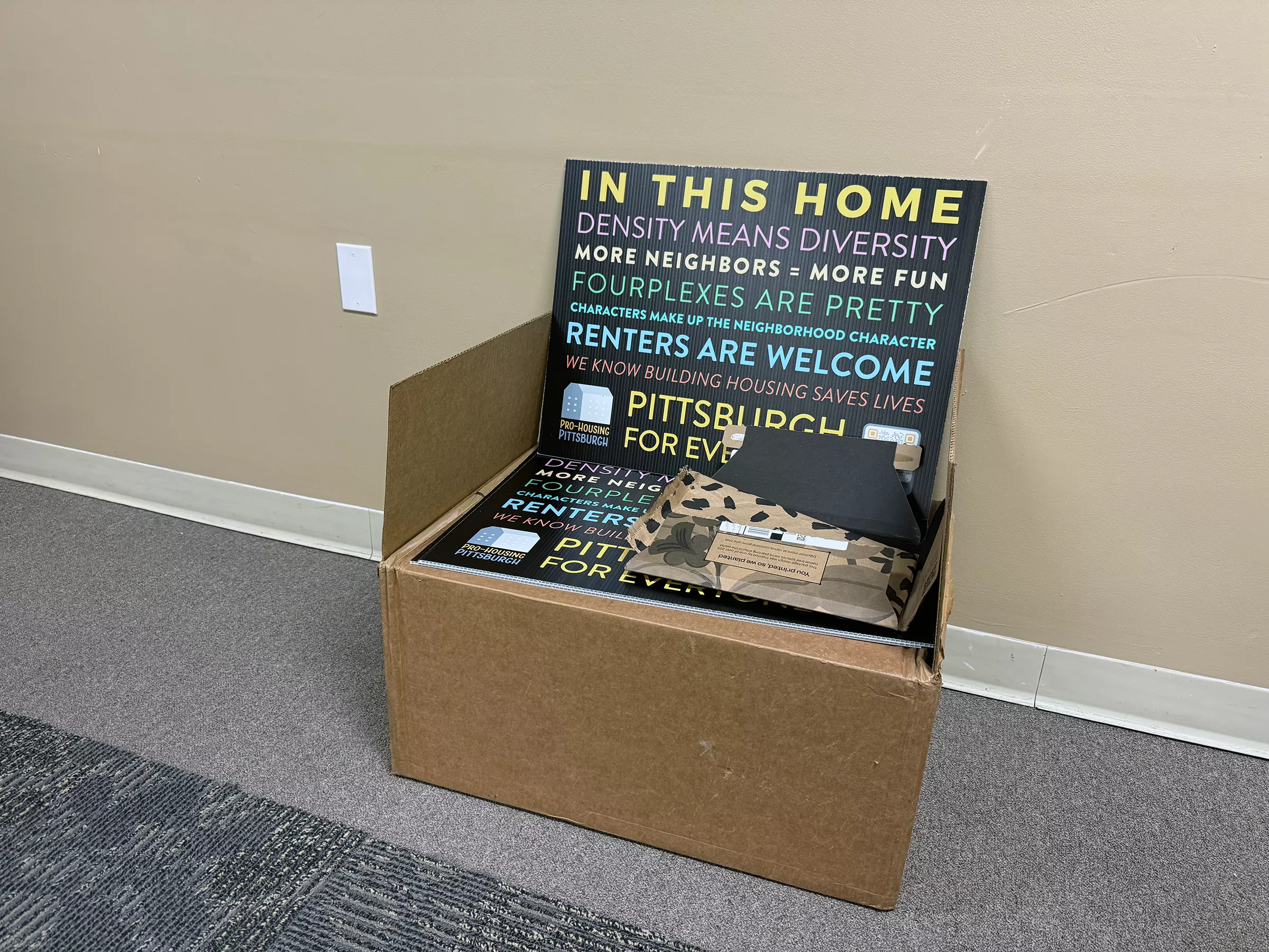 Housing justice activists criticize Pro-Housing Pittsburgh for using these signs that they say appropriates imagery from the Black Lives Matter and other social justice movements. Credit: Photo: David S. Rotenstein