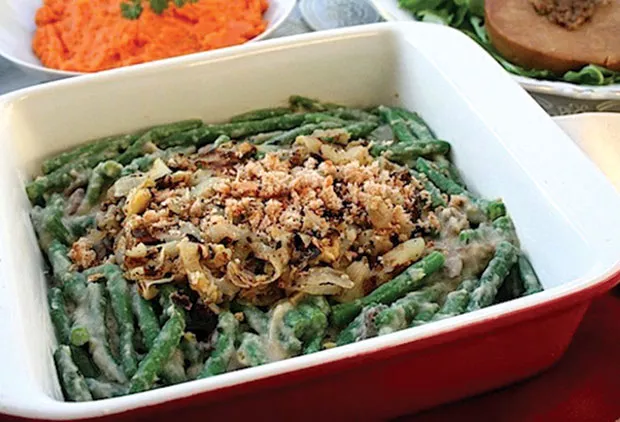 Bring water with a pinch of salt to a boil in a medium pot. Add prepped beans and blanch for 5 minutes. Beans should be bright green. Drain in a colander and immediately plunge beans into a large bowl of ice water to stop the cooking. Drain and set aside. Melt butter in a pot over medium-high heat. Add the mushrooms, tamari (or sea salt) and pepper, and cook, stirring occasionally, until the mushrooms begin to give up some of their liquid, approximately 4 to 5 minutes. Add the garlic and nutmeg, and continue to cook for another 1 to 2 minutes. Sprinkle the flour over the mixture and stir to combine. Cook for 1 minute. Add the stock and simmer for 1 minute. Decrease the heat to medium-low, and add the milk or creamer. Cook until the mixture thickens, stirring occasionally, approximately 6 to 8 minutes. Taste and adjust the seasonings. Remove cream mix from heat. Place green beans in casserole dish and pour cream mixture over top, thoroughly covering and combining. Top with fried onions. Place into the oven and bake until bubbly, approximately 15 minutes. Remove and serve immediately.