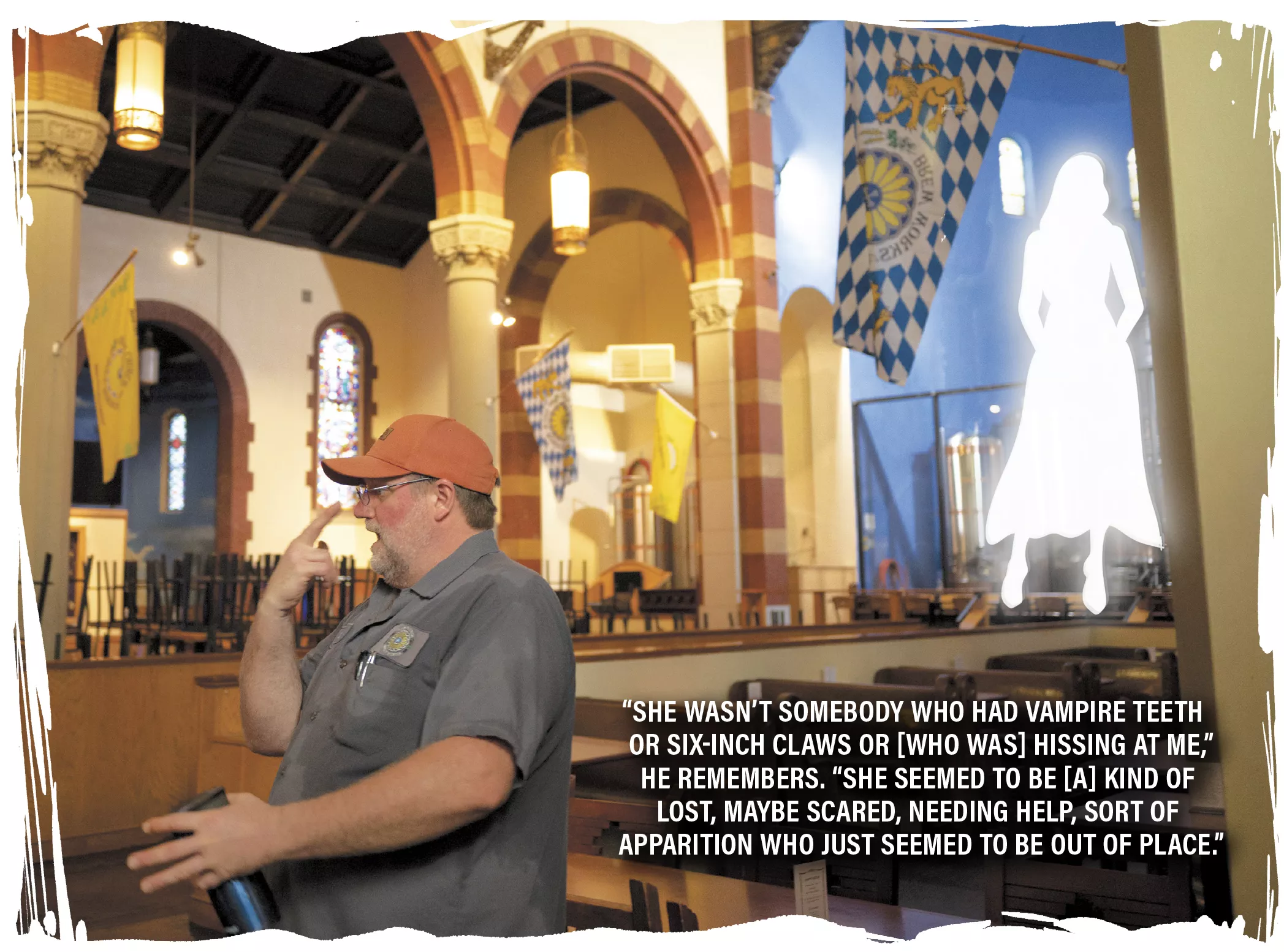 Another peculiarity was that only he could see the ghost, even though she appeared in the busiest parts of the restaurant. She manifested at a table along the apse at the front of the church and behind the altar where there are visible brew tanks.