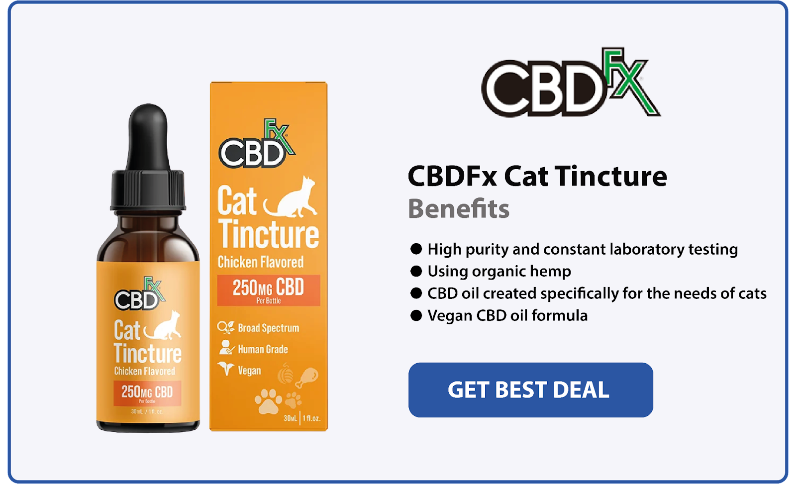 CBDfx’s 250mg CBD oil for cats typically costs around $34.99 but is often offered at a discounted price of $29.99.