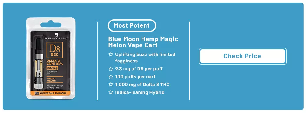 The strongest delta 8 carts are Blue Moon Hemp’s Magic Melon vape cartridges, which give 9.3 mg of Delta 8 THC per puff.