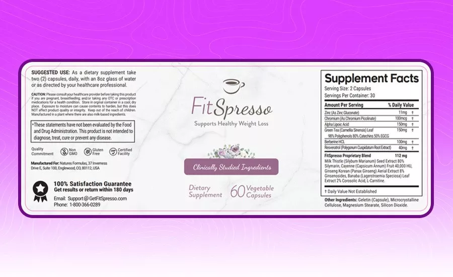 The FitSpresso supplement comes in capsule form and each batch contains 60 vegetable capsules. The formula is made in a lab facility that is NSF-certified, FDA-registered, and GMP-compliant. The manufacturer has third-party tested every batch and ensures that FitSpresso weight loss support supplement is free from soy, GMOs, BPA, dairy, and gluten. In the following sections, we will discuss other aspects of this weight loss formula.