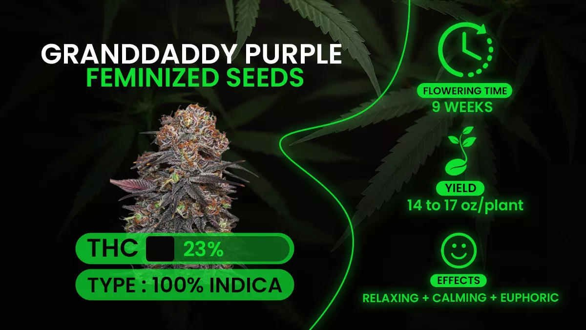 This strain grows best indoors in humidity-controlled environments, yielding up to 5 to 15 ounces in 7 to 10 weeks. Outside, it may grow taller, but the production will be about 4-6 ounces per square yard. Unlike most indica seeds., Granddaddy Purple prefers cooler climates and can withstand some cold, but be sure to harvest before the first frost sets in.