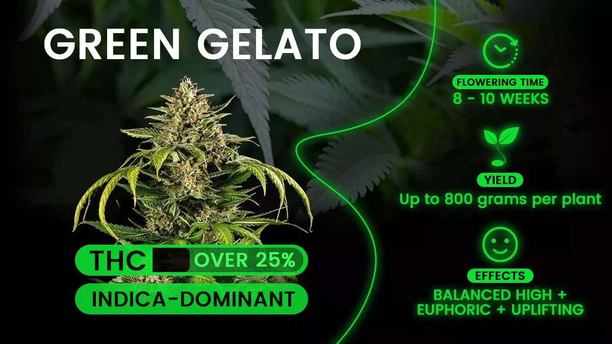Green Gelato is a potent indica-dominant hybrid resulting from the crossbreeding of Thin Mint Girl Scout Cookies and Sunset Sherbet. This combination has produced a strain with exceptional genetic stability and a rich terpene profile.