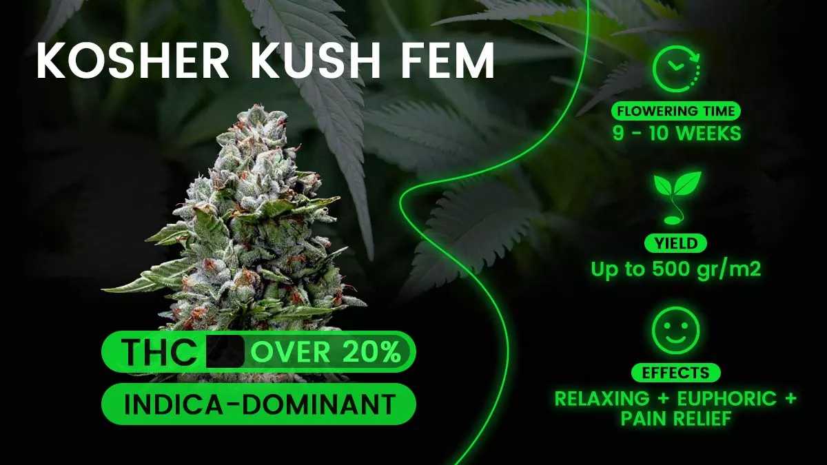 Kosher Kush is renowned for its powerful effects and robust growth patterns. This strain boasts a rich lineage, with its genetics tracing back to an elite Californian strain. As a feminized indica, Kosher Kush ensures that growers will only produce female plants, which are prized for their bud production.