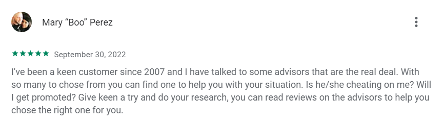 According to Mary’s Keen psychics review, she’s been an avid user of Keen since 2007. The psychics on the website helped her with various questions, such as ones regarding infidelity and job promotion. In her Keen review, she advises customers to “read reviews on advisors” to find the ideal one for their questions.