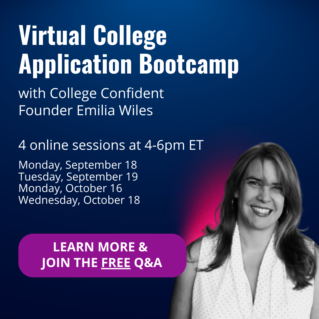 In my virtual College Application Bootcamp, families will receive step-by-step guidance as they begin and complete their college applications — from start to finish! The program features four sessions that take place live online. The program begins Monday, September 18. Payment plans are available. Plus, I’m offering a FREE workshop on Monday, September 11 where you can learn more and ask questions. For more info, visit CollegeConfident.org/bootcamp or email me at emilia@collegeconfident.org