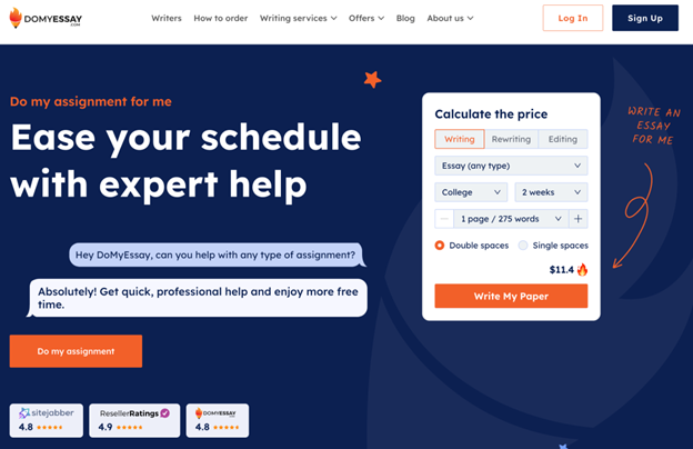 DoMyEssay has emerged as a trusted platform for academic support, earning its spot as the best assignment writing service for students navigating complex coursework. To test its reliability, we conducted a thorough evaluation by placing an order for a 6-page sociology essay with a 5-day deadline. The goal was to assess the quality of their work, delivery speed, and overall user experience.